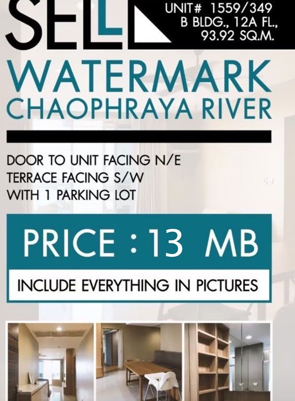 ขายพร้อมผู้เช่า คอนโด Watermark Chaophraya River 94 ตรม. ชั้น 12A ตึก B โทร. 0979.656.989 เจ้าของขายเอง pet-friendly เลี้ยงน้องหมาน้องแมวขนาดเล็กได้