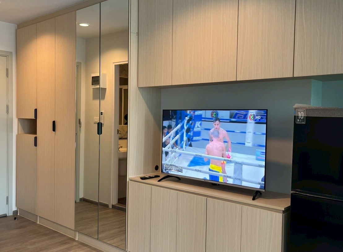 Furniture and Electrical appliances: Two 9,000 BTU air inverter, Eye-cat door and dead lock, key card Mirror sliding door between living room and the bedroom, Mirror sliding door between kitchen and living room, Mirror sliding door between living room and terrace Bathroom, dress up mirror in the rest room, two dress up mirror at the wardrobe, sofa bed for 3 seats, LCD TV 43 inches, one multipurpose table, bed and mattress 6 feet, blackout curtain in the bedroom, microwave oven, two doors refrigerator, soap dish Sanitary ware, wash basin, shower, one electric shower, washing machine, free one parking, water supply direct paid to Condominium Juristic Person, electricity directly paid to Electricity Generating Authority of Thailand